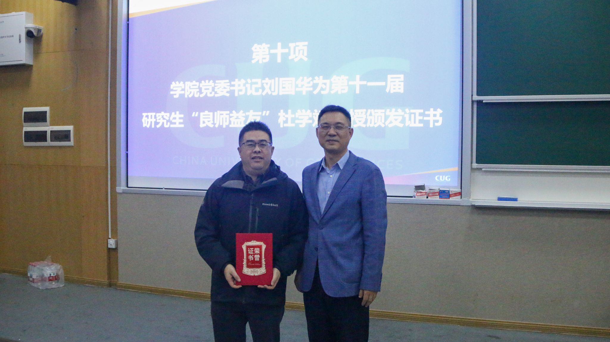 学院党委书记刘国华为第十一届研究生良师益友杜学斌教授颁发证书。