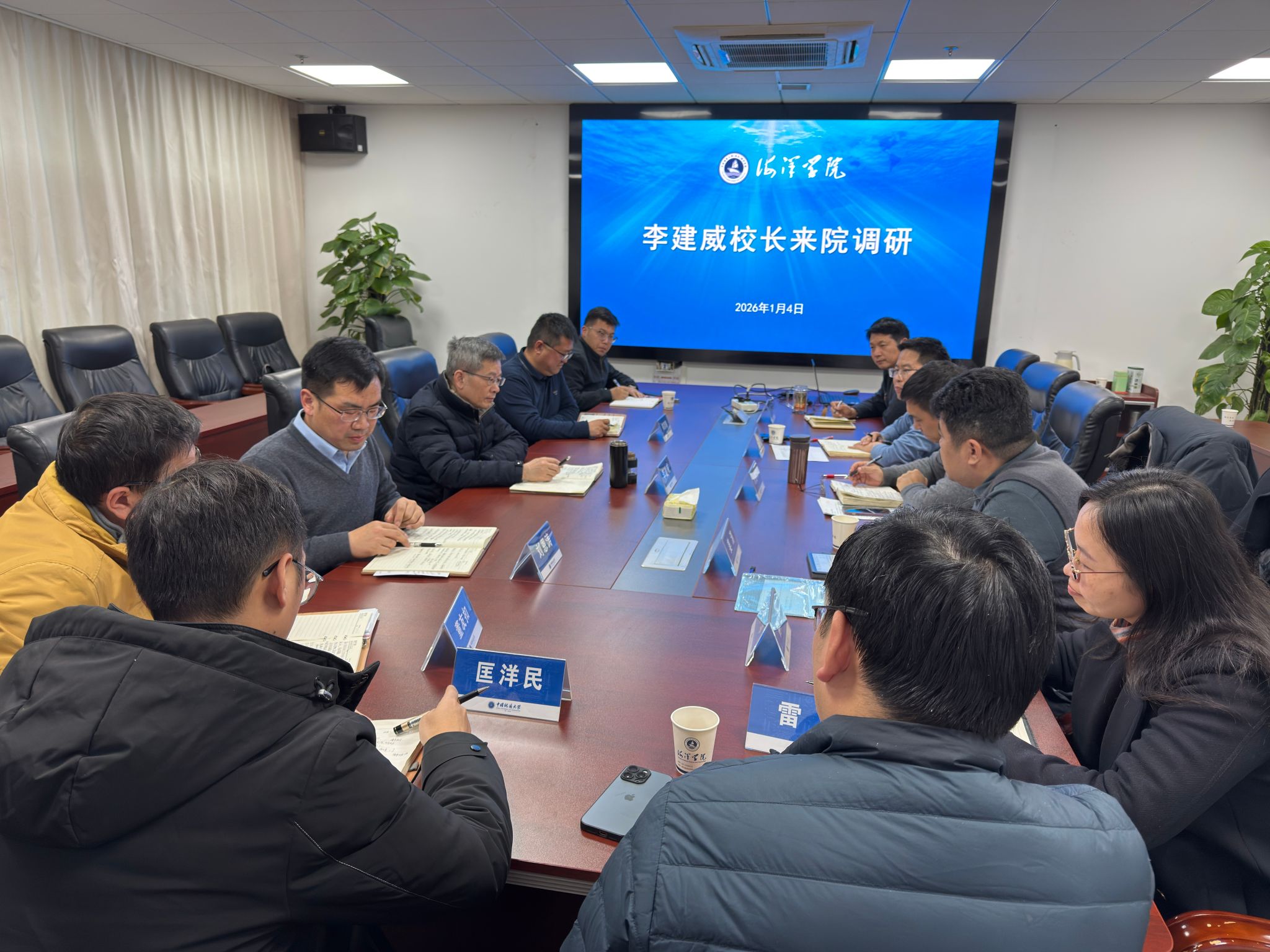 李建威校长充分肯定了学院在“十四五”期间取得的成绩,并就学院如何在“十五五”期间继续发挥海洋科学优势地位,支撑地球科学学科全面建设与优化提出指导意见。他强调:要更加明晰学科发展定位与学科方向布局,充分发挥优势学科方向潜力,提前布局深海采矿、极地科学、大洋科考等学科新领域并融合不同学科进行差异化、错位发展;要进一步加强师资队伍建设,大力引人育才,积极跟踪国内外契合重点发展方向的领军人才和海外青年学者,引进特需人才带动团队成长;要强化平台建设,拓展国际国内开放合作办学空间,引入好的资源助力学院发展;要从政治引领、能力提升、作风锤炼、团结协作等方面持续加强院系两级班子建设,在实践中提升把握方向、谋划发展的履职能力,凝聚攻坚克难、干事创业的强大合力。