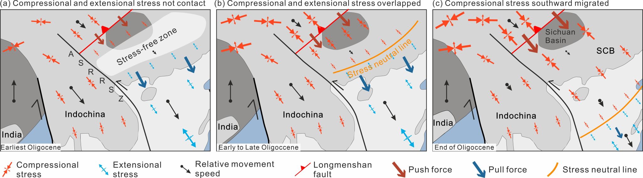 近日,娱乐城论坛 任建业教授带领的“大陆边缘动力学”研究团队在构造地质学领域国际顶级期刊《Tectonics》上发表了题为“Differential Extrusion of Indochina-South China Block and Its Interplay with Slab-Pull Tectonics: Evidence for End-Oligocene Basin Inversion in the Beibuwan Basin”的学术论文。该研究揭示了渐新世末期南海西北部广大区域内发育的(正)反转构造体系,标志着该地区新生代期间长期的走滑伸展成盆过程结束,进入到新近纪幕式构造挤压演化阶段。论文强调了这一构造反转作用是一个具有统一动力学背景的区域构造事件,创新性提出“双动力混合模型”和“应力中性线”等新概念,合理解释了渐新世末期南海西北边缘发生的这次强烈的构造体制转换,指出挤压应力源于松潘-甘孜地体的挤出作用,并与古南海俯冲-拖曳作用协同控制了南海的发育和演化过程,而挤压应力区和拉伸应力区之间“应力中性线 (Stress neutral line)”由北西向东南迁移引发了南海西北陆缘盆地广泛的构造反转、华南东南部的南岭附近抬升-夷平,南海西北次海盆停止扩张以及扩张脊南向跃迁等区域性的构造现象(图1)。