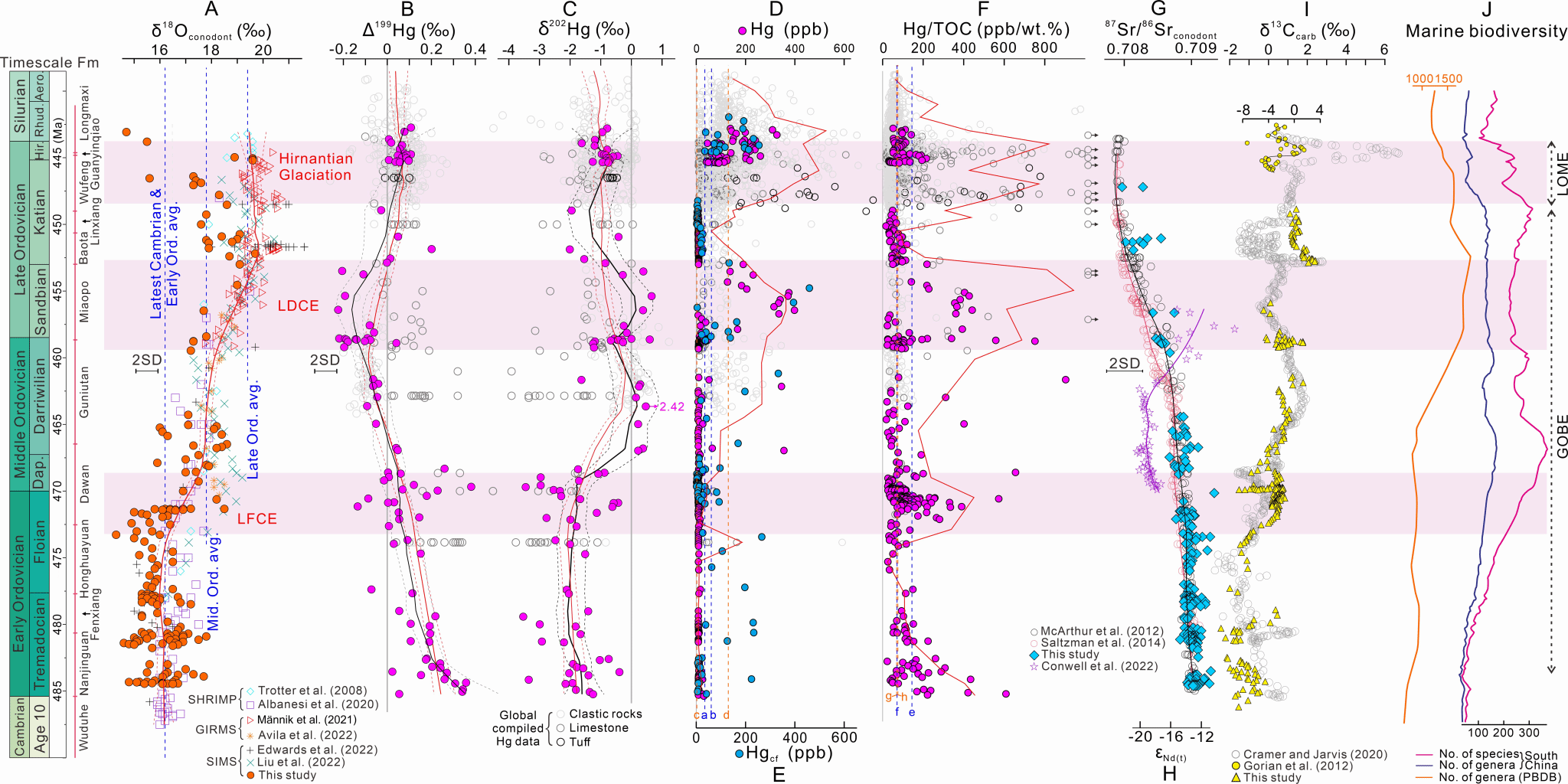 研究团队选取湖北宜昌地区黄花场剖面(全球中/下奥陶统界线“金钉子”剖面)、王家湾剖面(全球奥陶系赫南特阶底界“金钉子”剖面)和陈家河剖面(全球中/下奥陶统界线“金钉子”辅助剖面),开展了同一套样品多种关键地球化学指标的高分辨率研究:通过牙形石微区原位氧同位素(δ18O牙形石)重建古海水表层温度;利用汞元素指标(如Hg含量(Hg)、去碳酸盐汞含量(Hgcf)、汞与总有机碳含量比值(Hg/TOC)、汞与铝含量比值(Hg/Al)、汞与铁含量比值(Hg/Fe)、汞富集系数(HgEF))及汞同位素(Δ199Hg和δ202Hg)示踪火山活动;借助微区原位牙形石锶同位素(87Sr/86Sr牙形石)分析大陆风化强度。同时,研究进一步整合全球多个大陆/陆块~300个牙形石氧同位素数据(其中本研究数据170个),以及22条剖面的~1500个汞含量(其中本研究数据254个)和~400个汞同位素数据(其中本研究数据74个),以及配套的火山凝灰岩地层信息,构建了迄今为止最完整、最高分辨率的奥陶纪古海洋表层温度和火山活动对应关系的序列记录。