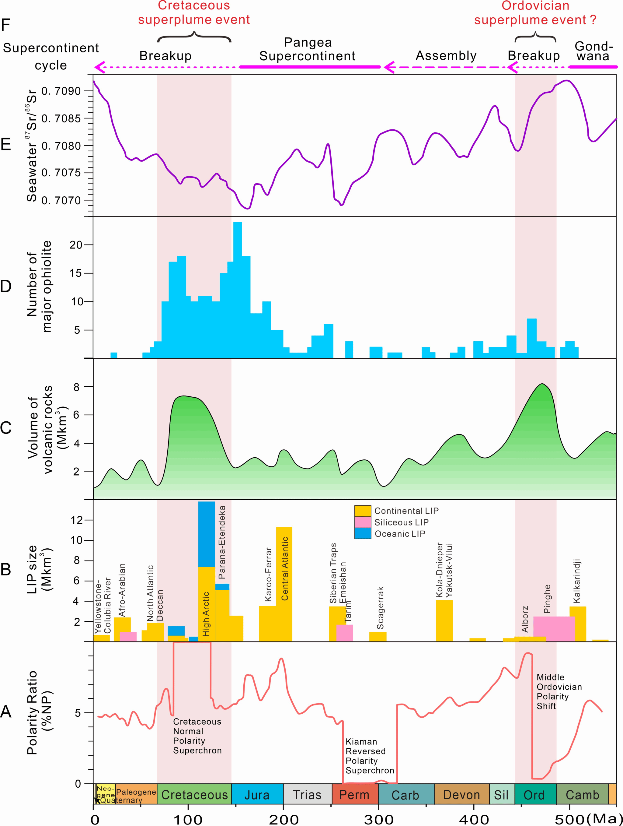 图4. 显生宙火山活动的地质记录揭示了奥陶纪可能存在的大火成岩省火山作用